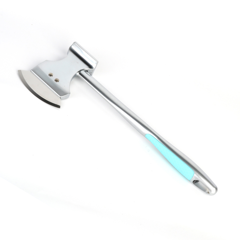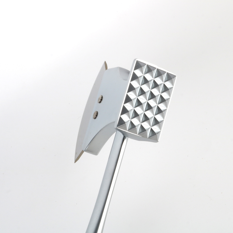 Alat semua-dalam-satu yang berfungsi sebagai pelembut daging aloi zink reka bentuk baharu dan pemotong piza, mempunyai panjang 25 cm. Hujung hadapan dibahagikan kepada dua permukaan berfungsi: satu untuk pelembut daging dan satu lagi untuk pemotong piza. Pemegang direka bentuk dengan bentuk arka yang dioptimumkan dan bahagian pemegang berhampiran cengkaman juga lebih tebal dengan satu tangan untuk memegang plastik ABS dengan kukuh. ditambah pada ekor pemegang untuk mengurangkan kesakitan tapak tangan dan meningkatkan keselesaan semasa penggunaan berpanjangan.