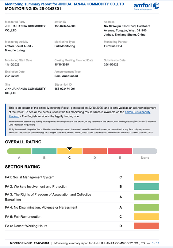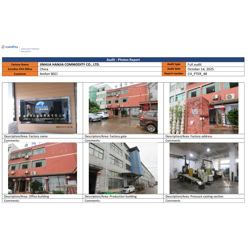 Jinhua Hanjia Commodity Co., Ltd. telah mengeluarkan hasil audit BSCI. Pembuka, aksesori wain dan produk keluli tahan karat seperti shaker koktel dari syarikat kami untuk masa yang lama. Negara pelanggan memerlukan pembekal untuk memiliki pensijilan ini.